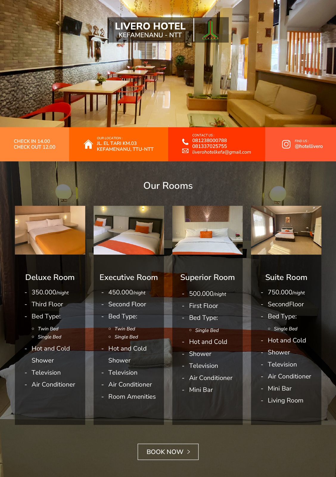 Untuk Informasi & Reservasi bisa melalu no Whatsapp yang tercantum di google maps, atau email liverohotelkefa@gmail.com, atau langsung di alamat Hotel Livero, Jl. Eltari KM 3, Kota Kefamenanu, Kabupaten Timor Tengah Utara, Nusa Tenggara Timur.
