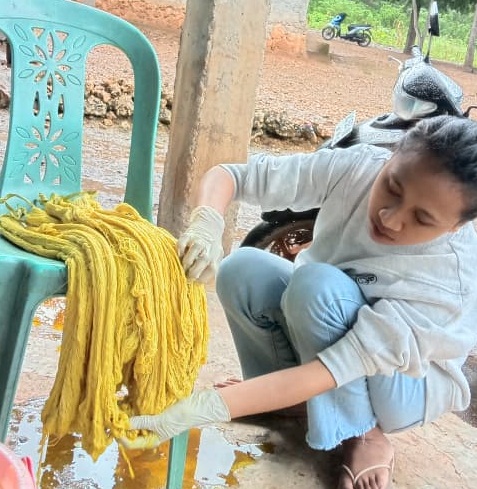 “Benang kemudian dimasak selama 45 menit dalam ekstrak daun tersebut, lalu direndam dalam cairan fiksasi selama satu malam untuk mengunci warna,” jelas Yeane.