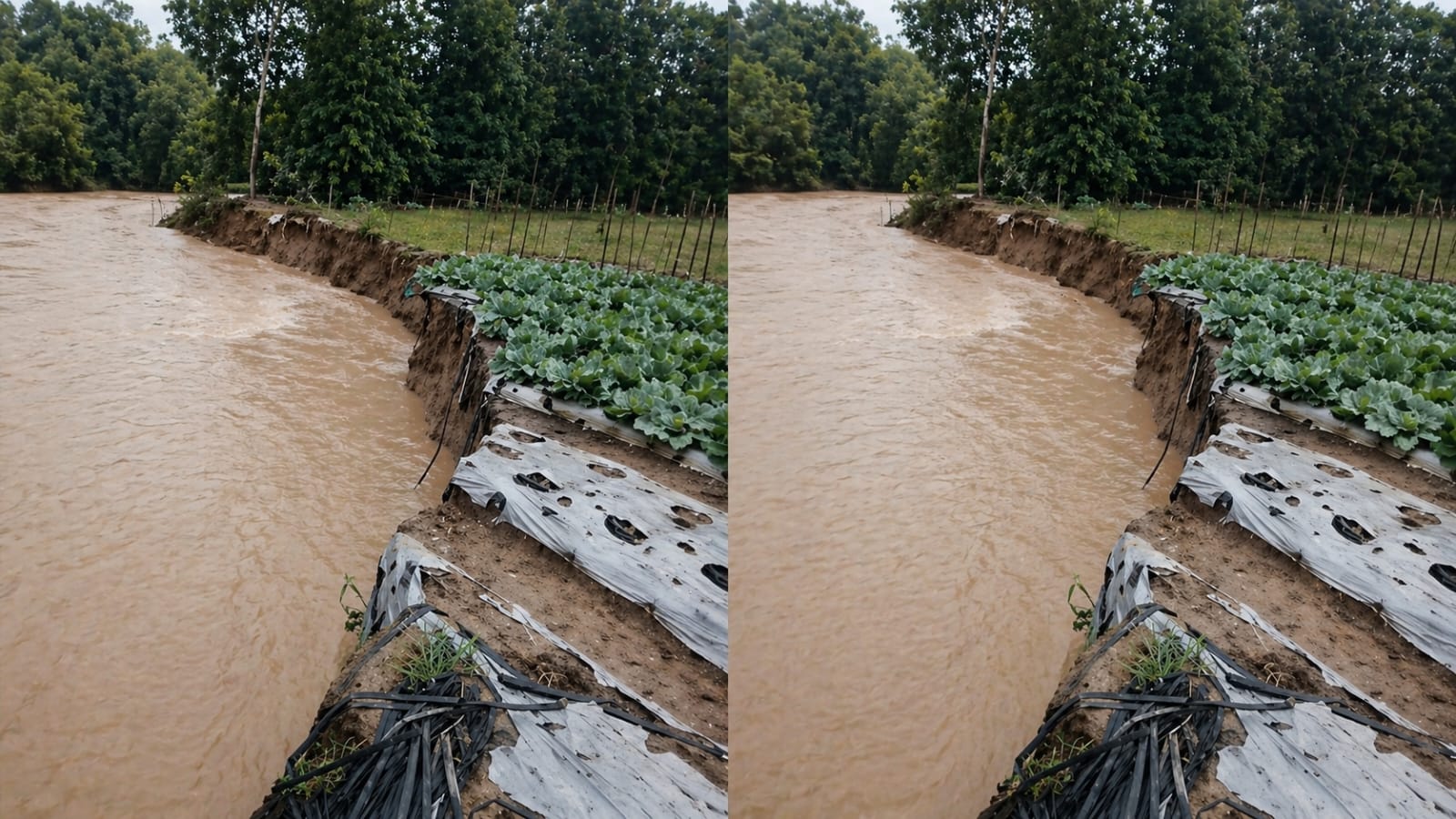 Selain itu, lahan pertanian mengalami kerusakan serius akibat tergerus arus. Kandang ternak babi dan rumah kompos juga terdampak dan terancam roboh.